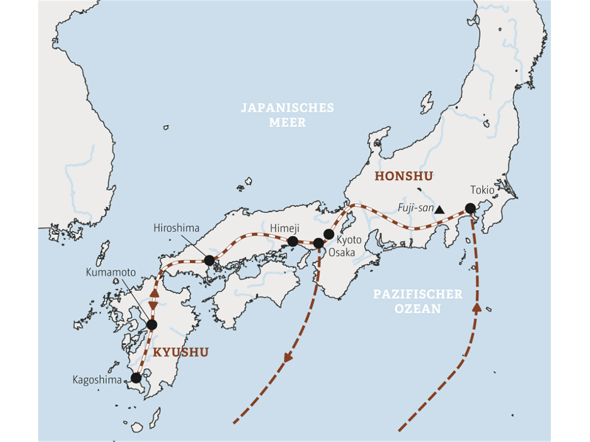 Wie die Locals entdecken wir Japan. Dabei verbindet der Shinkansen für uns die Highlights einmal quer durchs Land: die Mega-Metropole Tokio, Sehenswertes wie Hiroshima und Kyoto, schwarze und weiße Burgen, rote Torii, goldene Tempel, stille Gärten. Wir grüßen den heiligen Berg Fuji von fern und kommen dem feurigen Vulkan Sakurajima abenteuerlich nah. Und für Ihre individuellen Entdeckungstouren füttert Ihr Scout Sie mit spannenden Inspirationen …