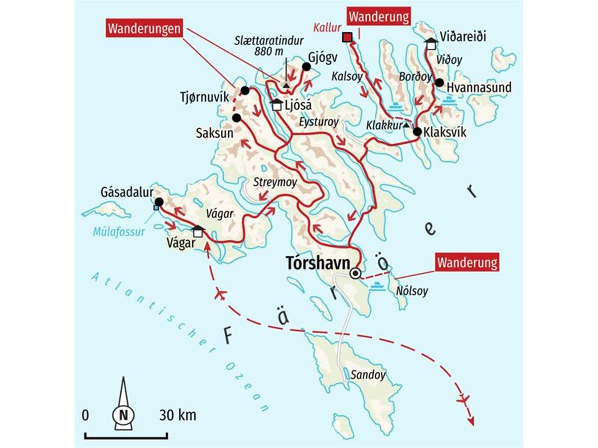 Wir machen uns heute auf den Weg zu den Nordinseln. Die Fahrt entlang der Küstenstraßen und über Bergpässe, welche die Dörfer auf den kleinen Inseln miteinander verbinden, gewährt uns dabei immer wieder beeindruckende Ausblicke auf die schroffen Berge und tiefen Fjorde. Unterwegs machen wir Halt in Klaksvík, dem Fischereizentrum der Färöer auf der Insel Borðoy. Im imposant gelegenen Ort beobachten wir das rege Treiben im Hafen und vielleicht bleibt uns noch Zeit, die Aussicht vom Hausberg Klakkur zu genießen. Schließlich erreichen wir Viðareiði, die nördlichste Siedlung, die idyllisch an einer Landenge und am Fuße eines Berges schlummert.