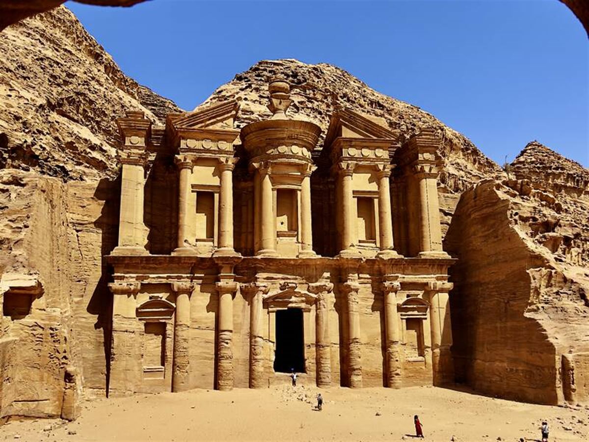 Wir wandern zwischen Felswänden durch den Sik, bis uns der Atem stockt: Staunend stehen wir vor der Schatzkammer von Petra. Eigentlich ist die ganze Stadt ein einziger Schatz! Paläste, Tempelfassaden, Königsgräber, Säulenstraßen – alles meisterlich aus dem Sandstein geschlagen. Solche Eindrücke verlangen nach einer Rast bei Tee und Süßigkeiten. Wer Lust hat, weiter hinaufzusteigen, schlägt nachmittags individuelle Pfade ein und folgt dem Pilgerweg hinauf zum Heiligtum Ed-Deir. Am Abend laden uns Beduinen bei Fackelschein zum Dinner ein. Wie schön, in so kleiner Runde auf Nomadenart im Kreis zu sitzen! Das Essen duftet, die Flammen knistern …