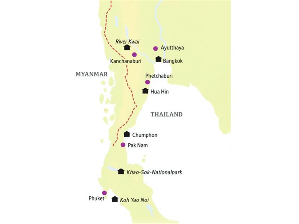 Die Brücke über den River Kwai, der Heldenfriedhof, die Khao-Luang-Höhlen bei Phetchaburi, wo wir in tropfnasse Felskammern steigen und goldene Buddhas hinter glimmenden Räucherstäbchen lächeln sehen, der Sommerpalast von König Mongkut, der auf einem Hügel thront. Von hier können wir unserem Tagesziel zuwinken: Hua Hin am Meer. Abends eine Thai-Massage im kleinen, stylishen Loligo Resort? Zum individuellen Abendessen locken Garküchen auf dem Markt mit unterschiedlichen Geschmackserlebnissen.