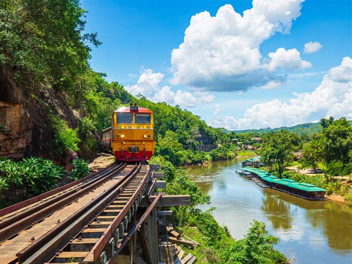 Im Bus nach Kanchanaburi und eineinhalb Stunden weiter mit der Death Railway Richtung River Kwai. Todesbahn? Ihr Reiseleiter kennt die Hintergründe. Reisfelder, Dörfer und Schluchten ziehen am Zugfenster vorbei, und wir landen direkt am Fluss in einem tropischen Paradies: Im Dschungelgrün erwartet uns ein Pool zum Erfrischen. Er gehört zu unserer 76-Zimmer-Oase Resotel. Gut, dass wir am Nachmittag Zeit haben, alles entspannt zu genießen. Zwei Übernachtungen am River Kwai.