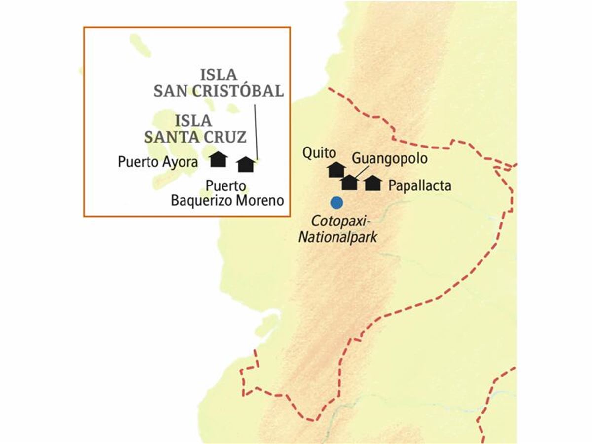 Im Hochland von Santa Cruz staunen wir in der üppig grünen Landschaft über die Zwillingskrater Los Gemelos. Bewegt sich da etwas? Gemächlich kriechen uns Riesenschildkröten entgegen. Unser Mittagessen müssen wir jedoch nicht mit ihnen teilen. Wer möchte, kann zuvor durch einen Teil eines Lavatunnels spazieren. Auf einer familiengeführten Farm erhalten wir einen Einblick in das ländliche Leben der Inseln und lassen unsere Reise bei einer Tasse frisch gerösteten Galápagos-Kaffees entspannt ausklingen.