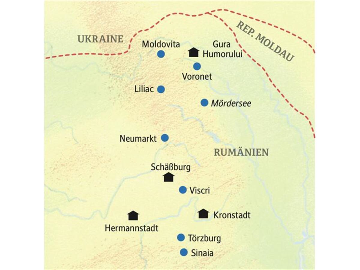 Ein kleines Juwel auf unserem Weg in die Bukowina: der Kulturpalast im Jugendstil in Neumarkt (Targu Mures). Dem Kunstgenuss folgen Schätze aus transsilvanischen Kellern im Weingut Liliac: Beim Mittagsimbiss mit Weinprobe überzeugen wir uns, dass Rumäniens frische, mineralische Weißweine längst über alle Vorurteile erhaben sind. Beschwingt geht es weiter durch Transsilvaniens Wälder und die Bergwelt der Karpaten. Eine echte Idylle: Ana, Olga, Ramona, Nela - unsere schnuckeligen Gästehäuser im La Roata in Gura Humorului mit 19 rustikalen, gemütlichen Zimmern. Entscheiden Sie am freien Abend selbst, was Sie essen möchten. Zwei Übernachtungen.