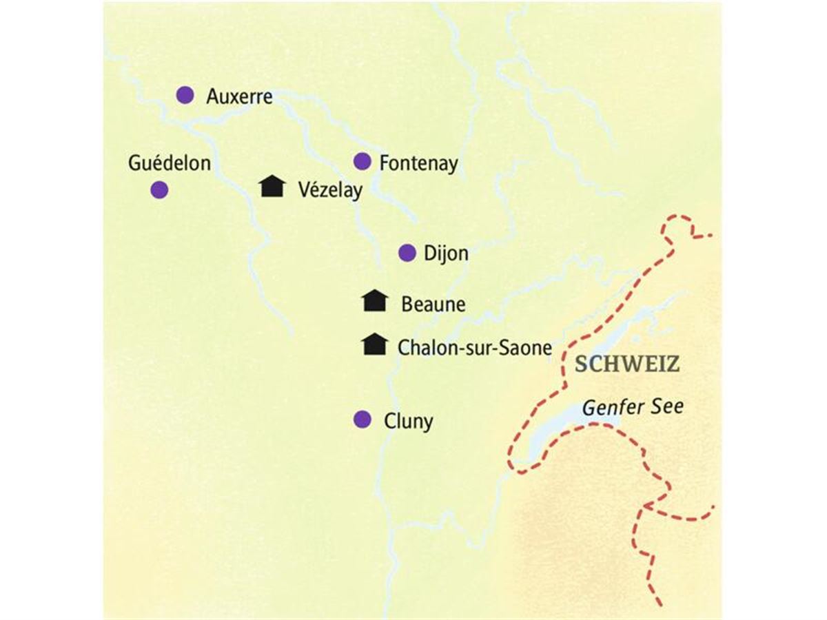 Wir folgen dem Lauf der Yonne durch ihr hübsches Tal nach Auxerre, wo wir die Postkartenidylle am Fluss bestaunen: Hausboote und Lastkähne vor der Kulisse der Stadtsilhouette. Hier spazieren wir durch die Fachwerkgassen zu Uhrturm und Kathedrale und schauen uns in der Krypta von St-Germain die mittelalterlichen Fresken an, die als die ältesten Frankreichs gelten. Abends in Vézelay verbringen wir unseren letzten gemeinsamen Abend nochmals in einem netten Restaurant und stoßen gemeinsam auf die vergangenen Tage an. Santé - et au revoir!