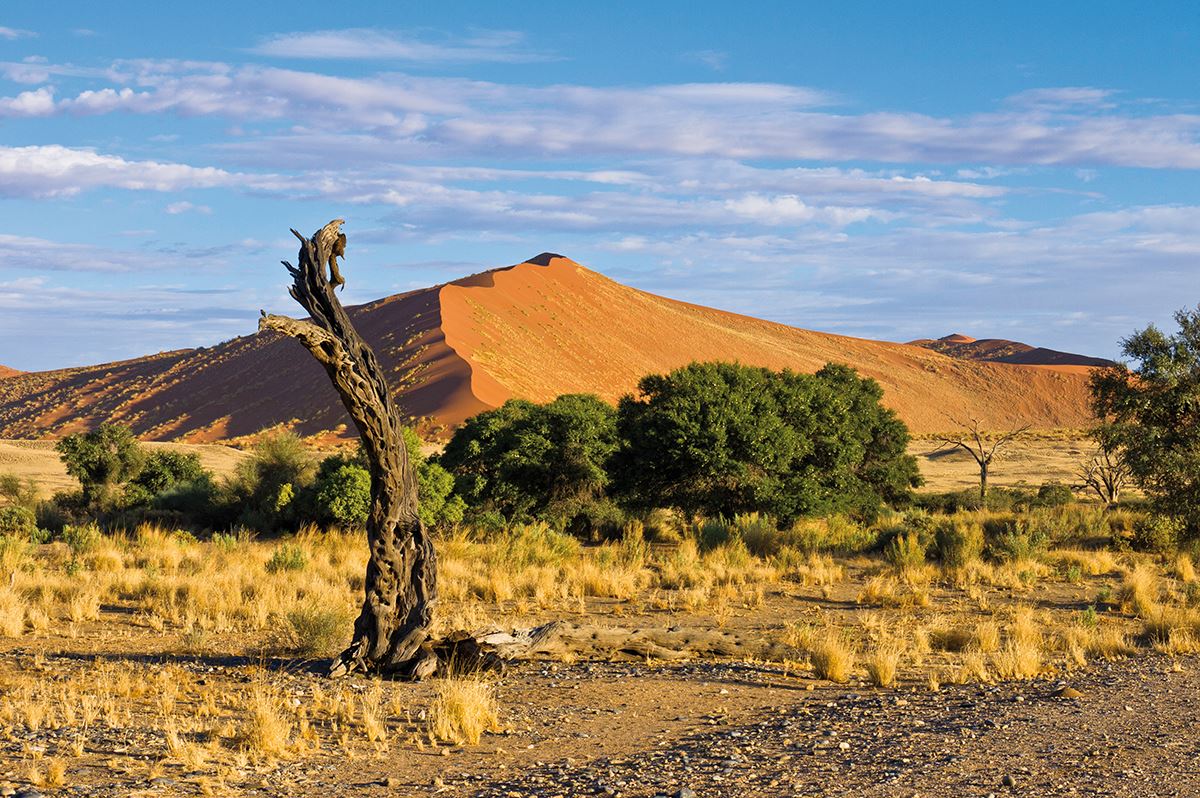 Schon vor Sonnenaufgang klingelt der Wecker. Wir fahren zu den roten Dünen am Sossusvlei. Das letzte tiefsandige Stück ins Vlei legen wir mit wüstentauglichen Fahrzeugen zurück. Von hier können wir das beeindruckende Farbspiel von Sonne und Schatten auf den höchsten Sanddünen der Welt bewundern. Wer wagt den Aufstieg? Von oben haben wir eine fantastische Aussicht über das Dünenmeer. Auch ein Abstecher ins Dead Vlei. Die versteinerten Kameldornbäume auf ausgetrocknetem Lehmboden bilden eine surreale Kulisse inmitten der Dünenlandschaft. Anschließend erkunden wir den Sesriem-Canyon, eine 30 Meter tiefe und einen Kilometer lange Kalksteinschlucht. 300 km (F, A)