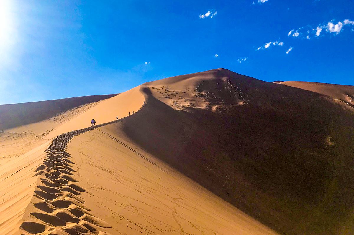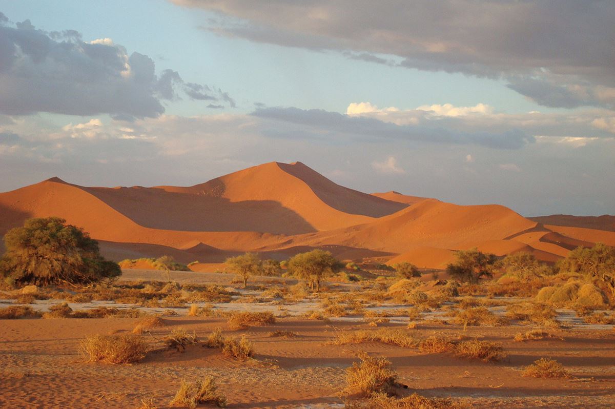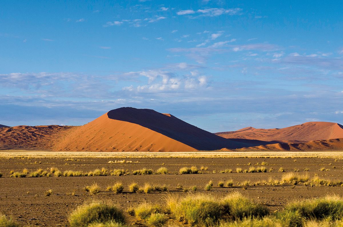 Auf ins Sossusvlei: eine riesige abflusslose Lehmbodensenke, umgeben von turmhohen Dünen. Wir machen uns in den kühlen Morgenstunden auf den Weg, wechseln zwischendurch auf wüstentaugliche Fahrzeuge, und sind rechtzeitig da, um das grandiose Farbspiel von Sonne und Schatten auf den höchsten Sanddünen der Welt zu bewundern. Wer wagt den Aufstieg? Das Deadvlei mit seinen abgestorbenen Kameldornbäumen gleicht einer surrealen Filmkulisse. Dann gehen wir bei einer leichten Wanderung dem Sesriem Canyon auf den Grund. Einen Kilometer lang und 30 Meter tief ist die Kalksteinschlucht, die vor vier bis zwei Millionen Jahren entstanden ist. 300 km (F, A)