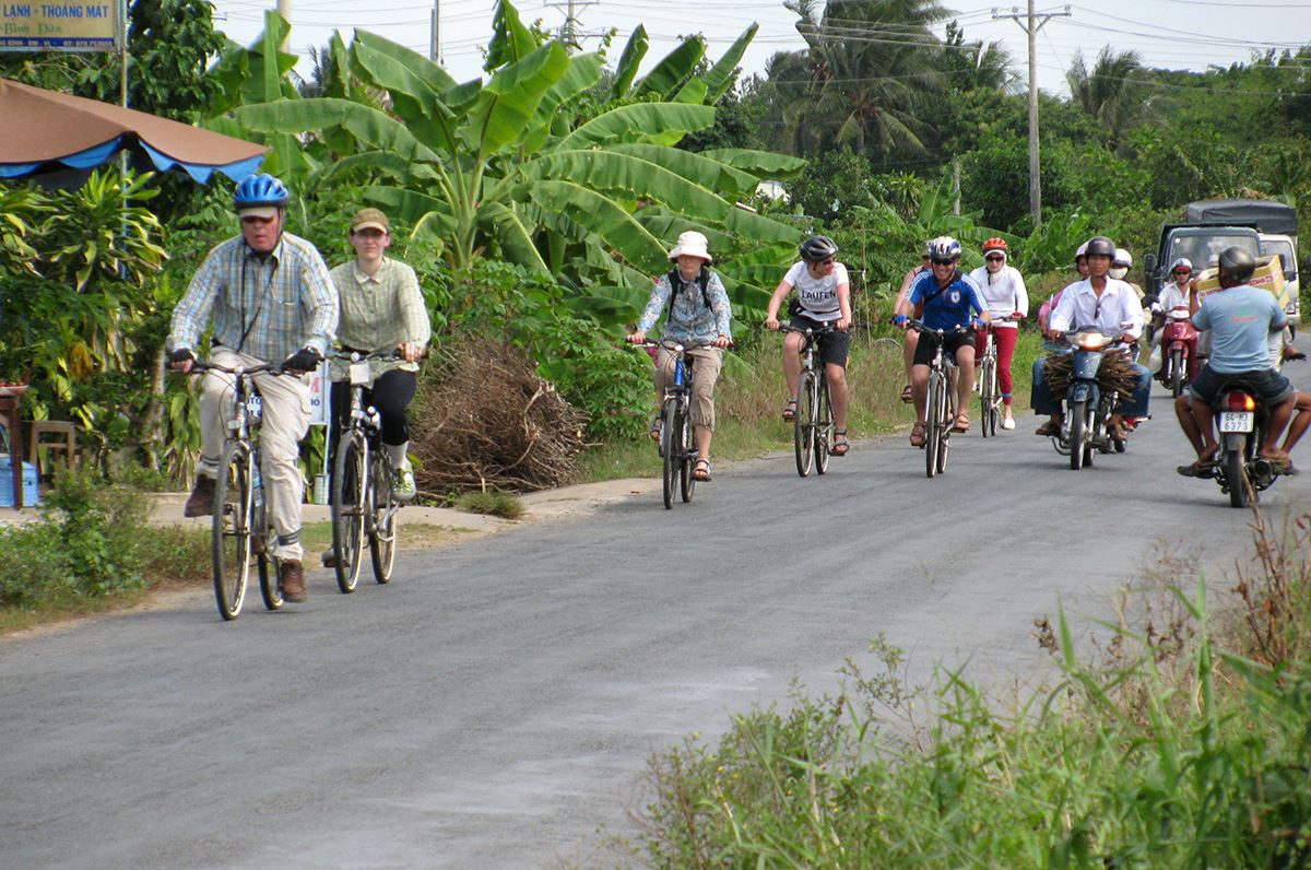 Sie fliegen nach Ho-Chi-Minh-Stadt, der führenden Handels- und Wirtschaftsmetropole des Landes. Zunächst geht es ins Mekong-Delta nach Cai Be, eine der wirtschaftlich wichtigsten Regionen des Landes. Per Pedes und per Rad erkunden wir die Reisschüssel Vietnams, schauen bei der Herstellung von Reispapier zu und staunen, was die Einheimischen aus getrockneter Wasserhyazinthe alles anfertigen können. In aller Ruhe kreuzen wir mit kleinen Ruderbooten durch die Seitenkanäle zu unseren Gastgebern für die heutige Nacht. Beim gemeinsamen Kochen tauschen wir uns aus und machen es uns später auf unseren Betten im Homestay gemütlich. 120 km