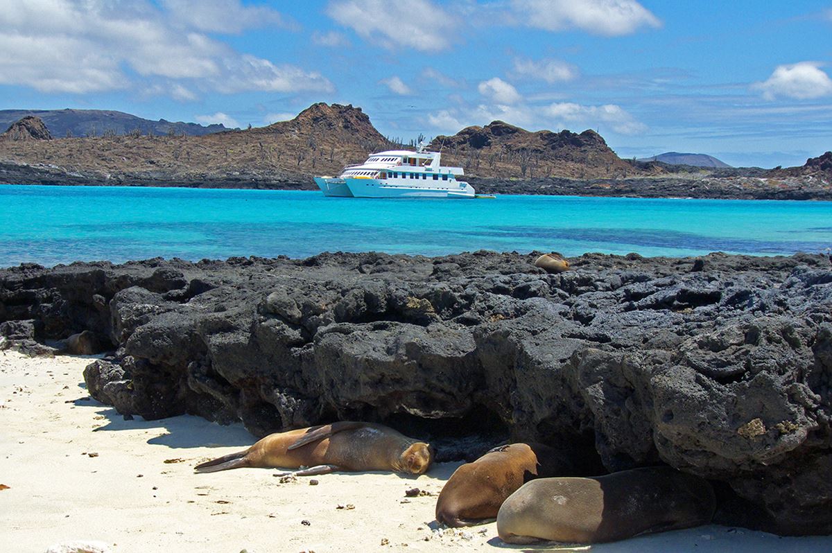 Es lohnt sich, die Kamera bereit zu halten. Wir landen in der goldenen Morgensonne auf der kleinen unbewohnten Insel Mosquera. Die kontrastreichen Farben - das strahlende Weiß des Strandes, das tiefblaue Wasser und die schwarzen Lavafelsen - bieten hervorragende Fotomotive. Nachmittags schaukeln wir der kleinen Insel Seymour Norte entgegen. Sie ist bekannt für ihre reiche Vogelwelt. Prächtige Fregattvögel nisten hier, Gabelschwanzmöwen hocken auf den Klippen und balzende Blaufußtölpel stellen ihre Füße zur Schau. Die Seelöwen beäugen uns faulenzend auf dem Strand und Landleguane kreuzen den Weg. Unberührte Natur pur!