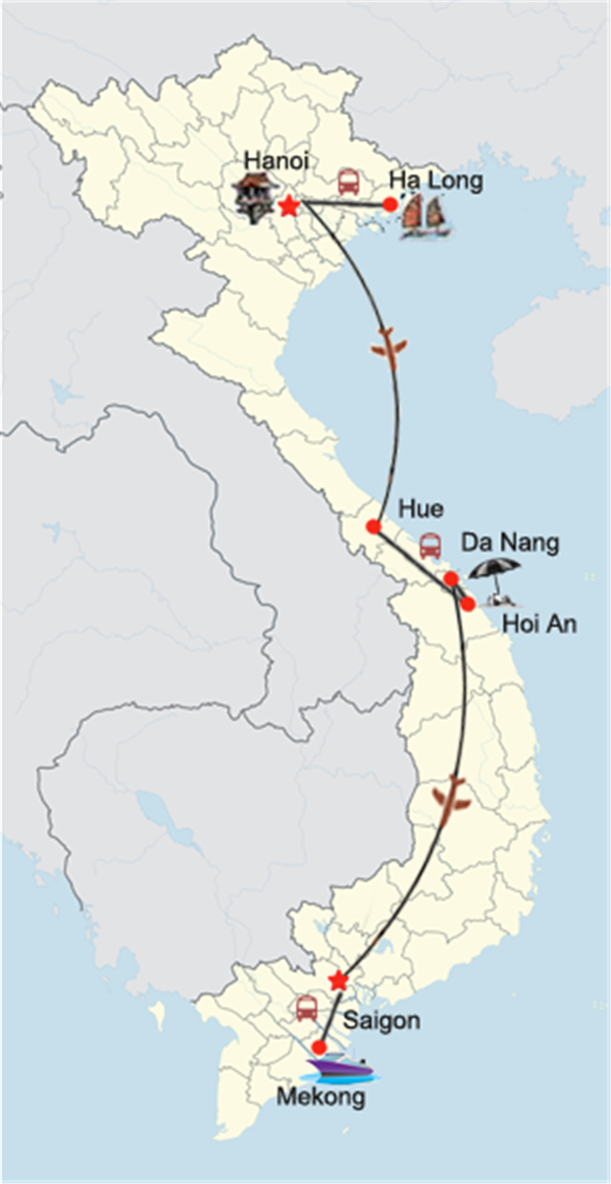 Nach dem Mittagessen steigen wir aus, steigen in den Van und fahren direkt zum Flughafen Hanoi, um am Nachmittag nach Hue in Zentralvietnam zu fliegen.