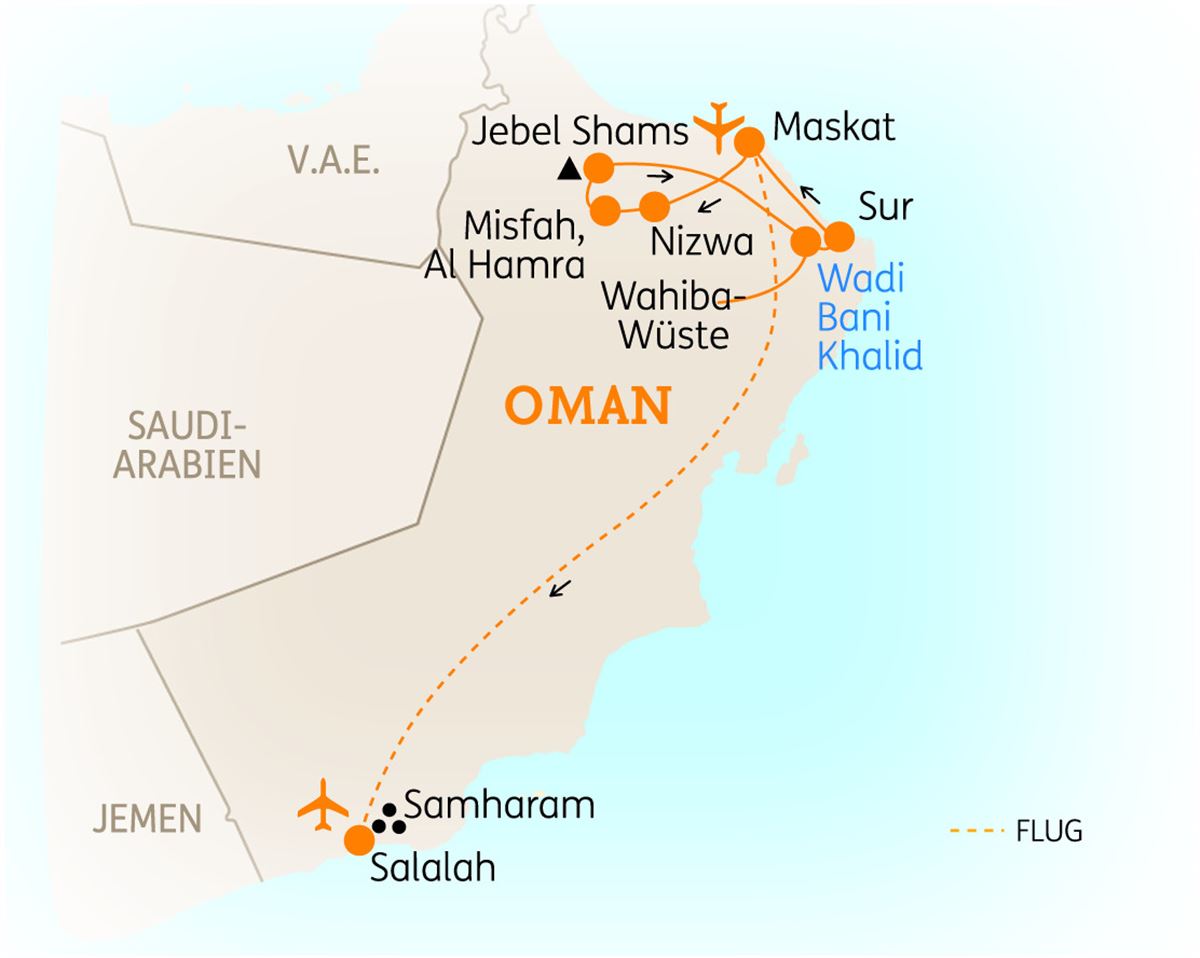 Am Morgen fliegen Sie nach Salalah in der Weihrauchregion Dhofar. Entdecken Sie die „Blowholes“ nahe des Fischerdorfes Mughsail, beeindruckende Felslöcher, aus denen die Meeresbrandung emporschießt (abhängig von den Gezeiten). Auf dem Weg ins Qara-Gebirge passieren Sie eine Vielzahl an Weihrauchbäumen. Nach der Rückfahrt ins Zentrum von Salalah und dem Check-In im Hotel machen Sie eine kurze Mittagspause, bevor Sie eine Stadtrundfahrt mit dem Kleinbus unternehmen. Besuchen Sie das Grab des Propheten Nabi Amran und das Weihrauchmuseum. Erleben Sie die Shanfari-Moschee (Außenbesichtigung) und den lebendigen Souk. 2 Nächte in Salalah. (F/A)