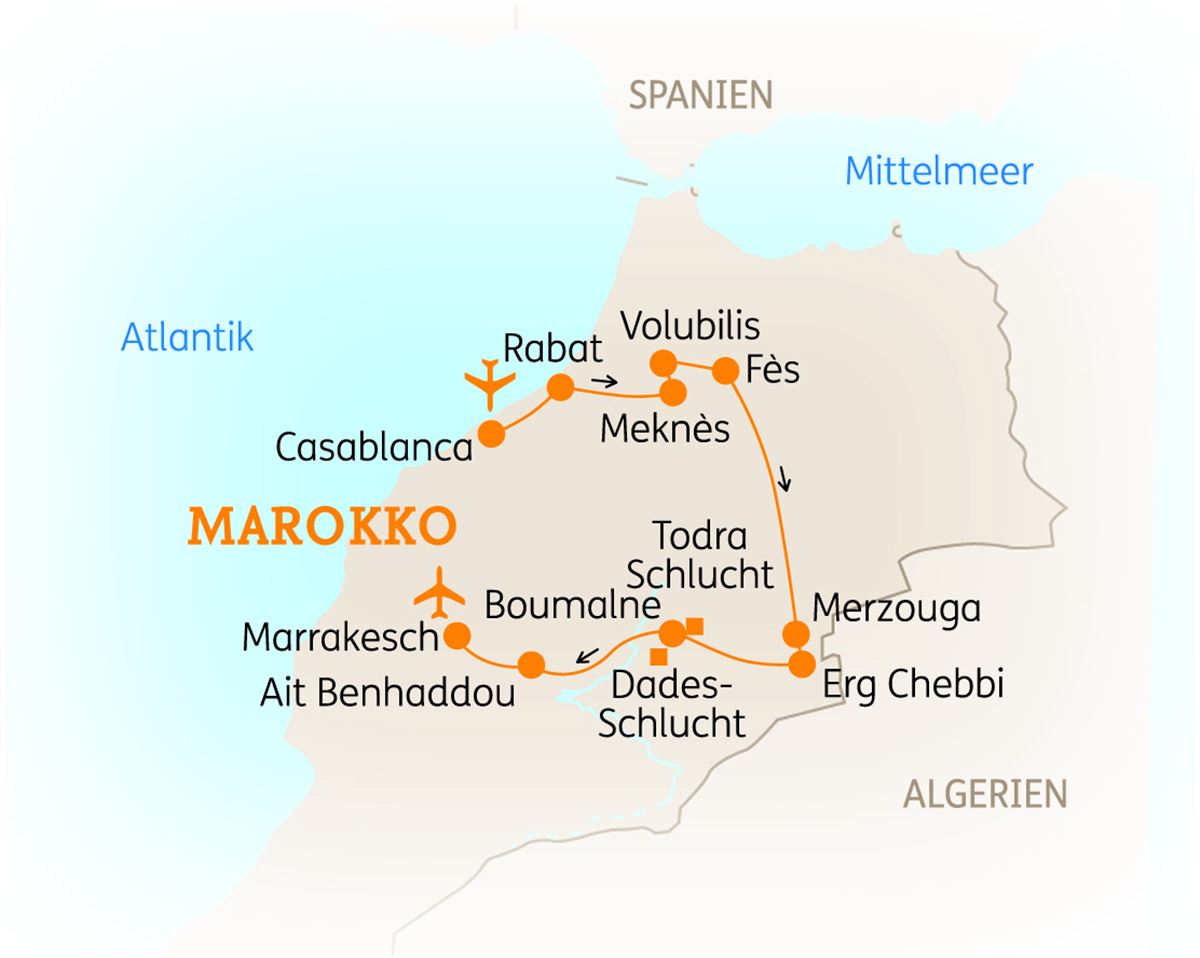Ihre Reise beginnt mit einem Flug nach Casablanca. Nach der Ankunft werden Sie herzlich empfangen und ins Hotel gebracht. 1 Nacht in Casablanca.