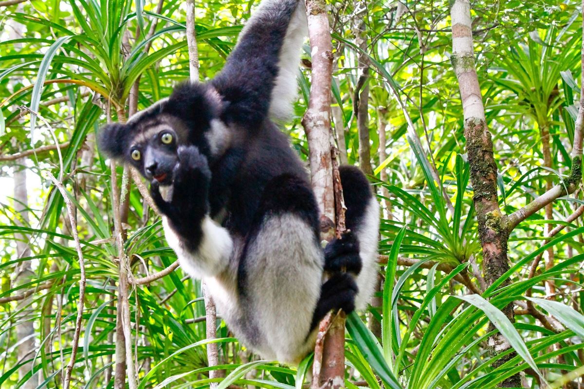 Unsere Reise führt uns zu den beeindruckenden Tsingy Rouge, einer einzigartigen geologischen Formation aus rotem Sandstein. Wir treffen auf drei Baobabarten, Palmen sowie die seltenen Fingertiere und Diademsifakas. In der geschützten Region von Andrafiamena liegt unser Camp inmitten des Regenwaldes. Das Black Lemur Camp unterstützt eine Aufforstungsinitiative und beschäftigt Siedler der umliegenden Dörfer.Die 13 auf Pfählen erbauten Holzbungalows bieten einen großartigen Blick in die Landschaft. Genießen Sie die herrliche Aussicht und lauschen Sie den Vogelstimmen und den Lauten der Lemuren. 90 km (F)