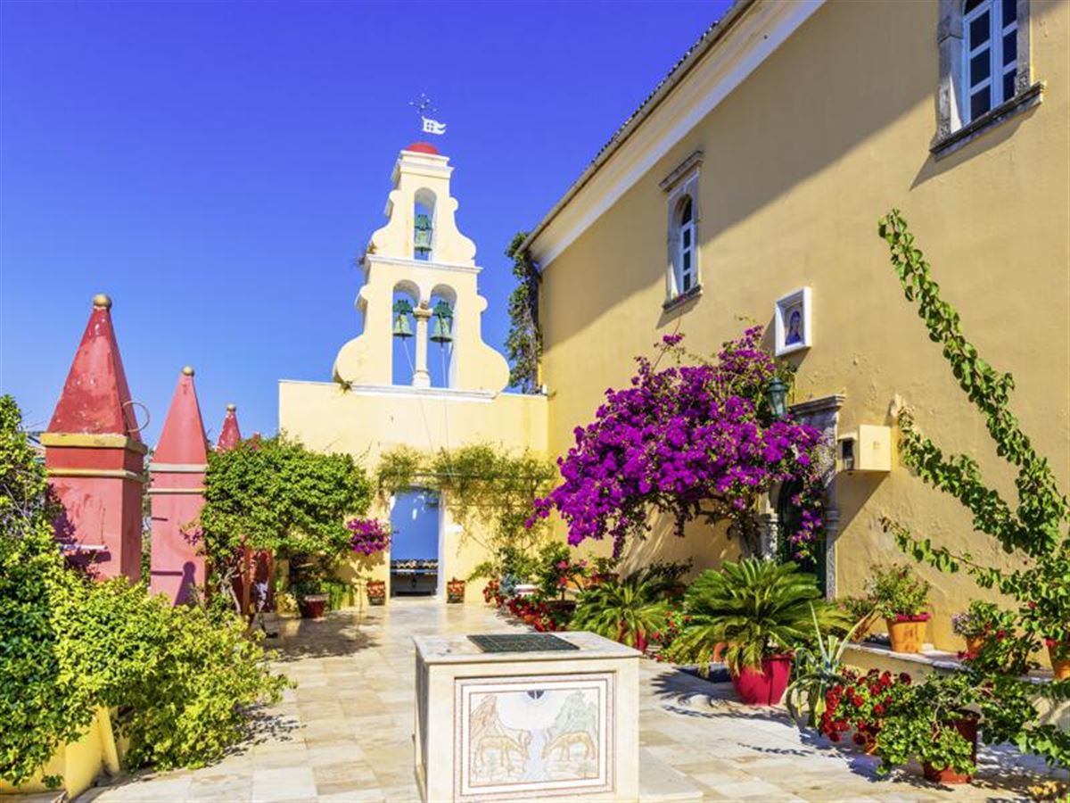 Wir beginnen den Tag mit einem Spaziergang durch den Schlosspark von Mon Repos, wo versteckte archäologische Funde zu entdecken sind. Vom Aussichtspunkt Kanoni blicken wir hinüber zum Kloster Vlacherna und auf die Mäuseinsel. Anschließend erkunden wir die Altstadtgassen von Korfu-Stadt (UNESCO-Welterbe) mit ihrem venezianischen, britischen und französischen Touch. Wir werfen auch einen Blick in die Agios-Spyridon-Kirche – der heilige Spyridon ist der Schutzpatron der Insel.