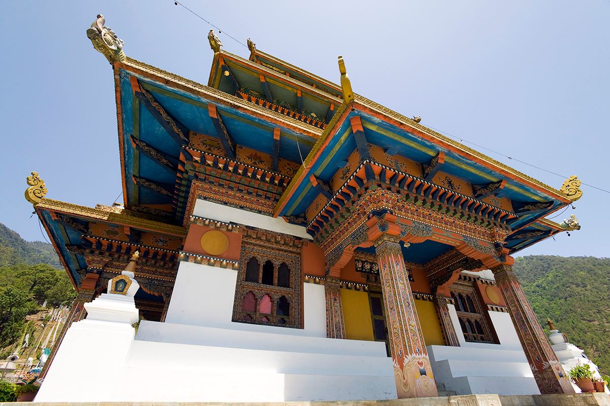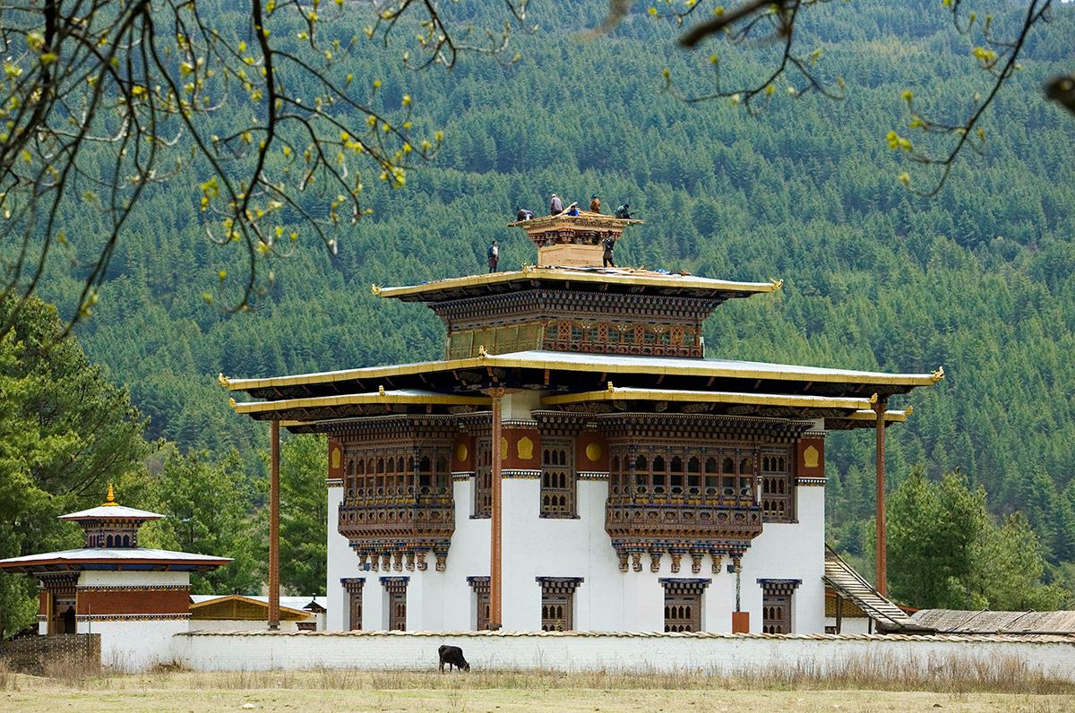 Spektakulär ist unsere Fahrt über den 3.100 Meter hohen Dochula-Pass. Die herrliche Berglandschaft mit Rhododendron-Wäldern und der Blick auf den Himalaya sind atemberaubend! Hier hat auch der seltene Schwarzhalskranich in einem Schutzgebiet seine Heimat gefunden. Am Nachmittag besuchen wir das Gangtey Kloster im Phobjikha-Tal und bestaunen die sehenswerten Holzarbeiten des Tempels. 150 km