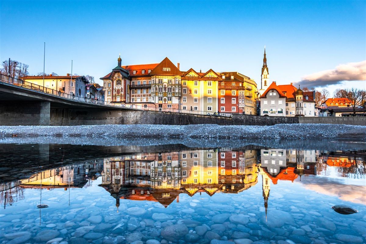 Durch die Straßen von Geretsried, laufen wir wieder hinunter zur Isar und folgen dem Fusslauf weiter nach Süden. Fraßspuren von Bibern, rauschende Strudel entlang der Hochufer und weite Kiesbänke begleiten die schmalen Pfade entlang des Flusses, in dem wir auch heute wieder ein erfrischendes Bad nehmen können. Gegen Mittag erreichen wir über den isarbegleitenden Weitwanderweg München – Venedig den Aussichtspunkt Malerwinkel, dem bislang höchsten Punkt unseres Flusstrekkings. Hoch über einer weiten Flussschleife machen wir Picknick und stärken uns für den langen Weg nach Bad Tölz, auf das wir vom Kalvarienberg einen ersten, schönen Blick werfen können. Unter uns liegt das von nostalgischer Kurorteleganz geprägte Bäderviertel und auch die sehenswerte, mittelalterliche Marktstraße, wo wir einkehren und übernachten werden.