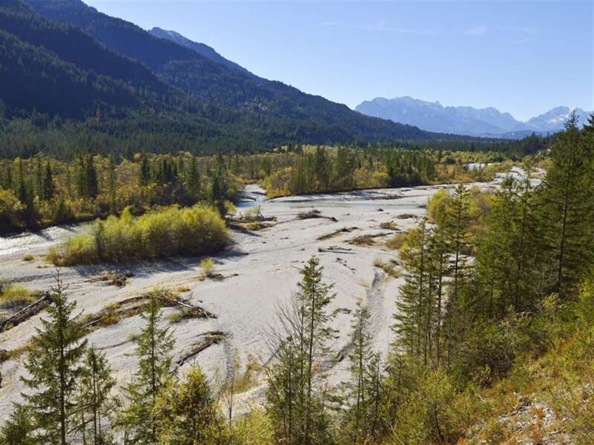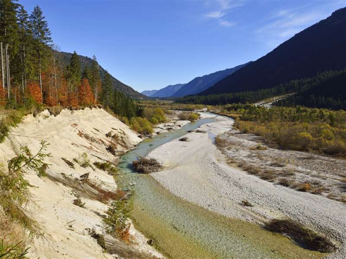Nach dem Frühstück laufen wir durch die schöne Marktstrasse zur Isarbrücke und auf der Ostseite des Flusses weiter Richtung Lenggries. Typische Isar-Ökosysteme wie Schneeheide-Kiefernwälder und Weichholzauen wechseln sich ab mit oberbayerischer Kulturlandschaft unterhalb des Münchner Skiberges Brauneck. Gegen Mittag erreichen wir die Bretonenbrücke und treffen auf unseren Taxi-Transfer, der uns vorbei am Sylvensteinspeicher bis ins Dorf Vorderriss bringt. Hier kehren wir zum Mittagessen ein. Am Nachmittag wandern wir dann durch Bayrisch-Kanada, einen mitten im riesigen Naturschutzgebiet Karwendel liegenden Flussabschnitt der Isar, der in seiner Unberührtheit und Wildheit Gedanken an die kanadischen Rocky Mountains aufkommen lässt. Ziel des heutigen Tages ist das in Sichtweite von Karwendel- und Wettersteingebirge liegende Dorf Wallgau, wo wir heute übernachten werden.