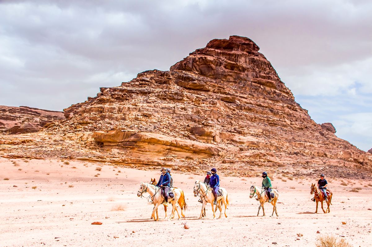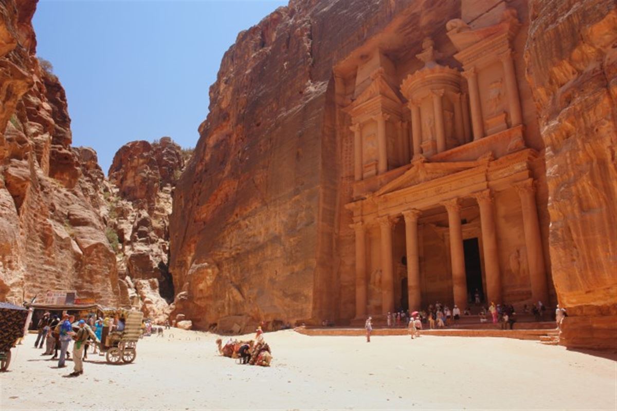 Ganz ohne nass zu werden, entdecken wir während einer Fahrt mit dem Glasbodenboot die weltberühmte Unterwasserwelt vor Ort. Weiterhin lassen wir auch den Besuch des Souks von Aqaba nicht aus. Wenn Sie sich bisher im orientalischen Feilschen schwer getan haben, hier und heute werden Sie es lernen. Unser nächstes Ziel bietet einen scharfen Kontrast zum Leben am Meer. Wir fahren durch die bizarren Felsformationen des Wadi Rum, ein guter Zeitpunkt, sich mit den erdgeschichtlichen Prozessen zu beschäftigen, welche vor rund 30 Millionen Jahren auch zur Formierung des Jordantals und des Golfs von Aqaba führten. Die Beduinen, die uns zum Mittagessen beherbergen, holen uns anschließend ins Hier und Jetzt zurück. Gut gestärkt fahren wir mit den Geländewagen in die Oase Rum durch die roten Sanddünenfelder, deren Zauber schon Lawrence von Arabien in ihren Bann schlugen. Schließlich kommen wir jenem Ort näher, der für viele Reisende der eigentliche Grund einer Jordanien Reise ist - Willkommen in der Felsenstadt Petra! 180 km