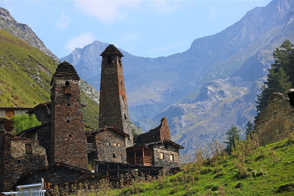 Einmal nach Tuschetien zu kommen, ist eine ganz besondere Erfahrung. Diese Region ist nur für einige Monate im Sommer zugänglich. Es steht Ihnen eine der weltweit spektakulärsten Hochgebirgsfahrten bevor. Per Geländewagen fahren Sie auf teils ausgesetzten Pisten und waghalsigen Kehren und Windungen hinauf zum Abano-Pass (2926 m) und dann ebenso beeindruckend nach Omalo (2080 m). Die Aussicht ist fantastisch und beängstigend zugleich. Adler und Falken, die auf den Felsen nahe der Straße nisten, fliegen in geringem Abstand zu den Fahrzeugen. Sie beziehen Ihr Gästehaus und nach dem Mittagessen begeben Sie sich auf einen ersten Spaziergang zu den mittelalterlichen Keselotürmen in Omalo.