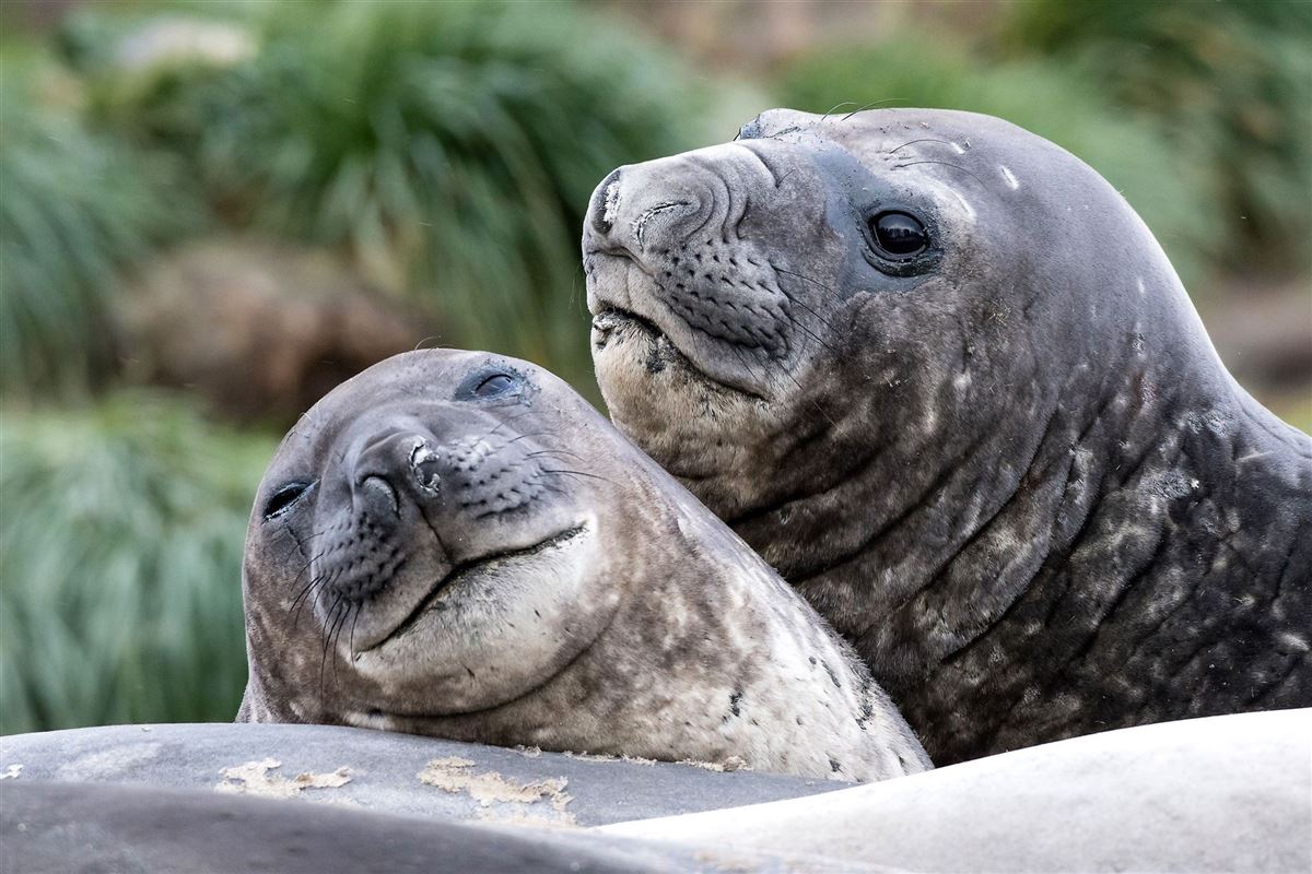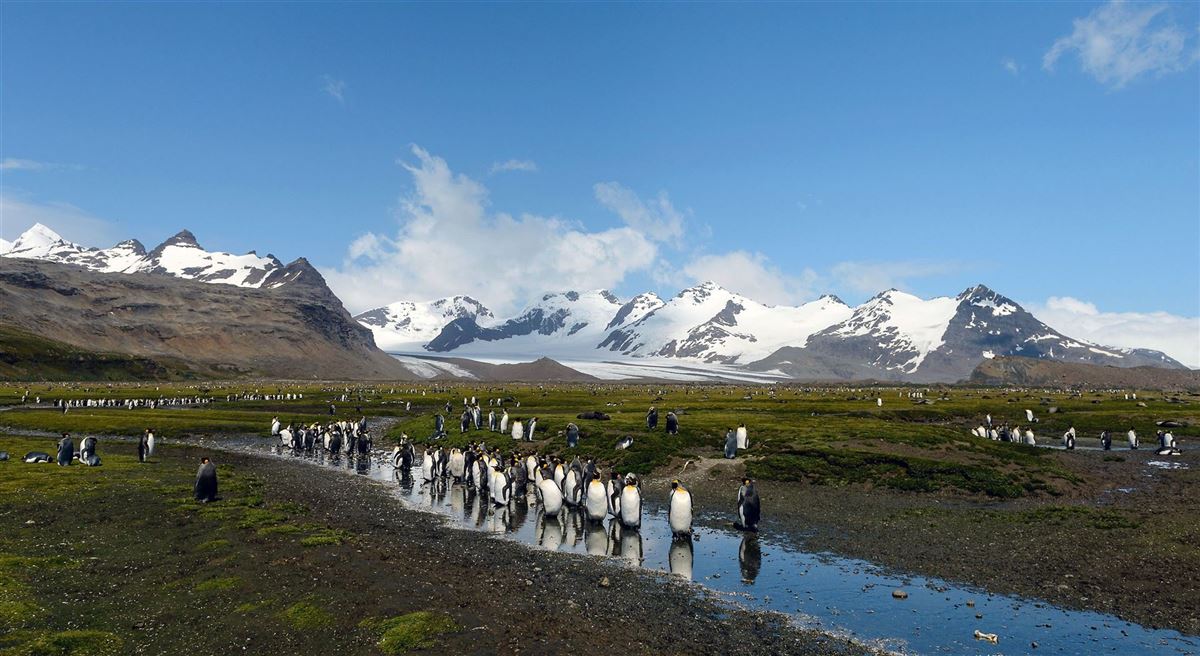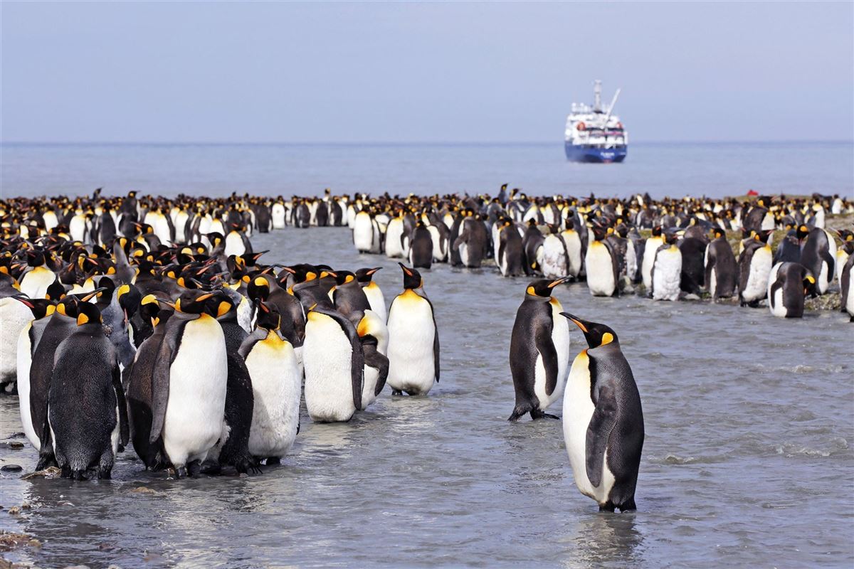 Salisbury Plain, St. Andrews Bay, Gold Harbour: Die drei größten Königspinguin-Kolonien der Welt befinden sich in Südgeogien – mittendrin die flauschigen Küken der großen Vögel. Die Strände sind ebenfalls Heimat der größten Herden der mächtigen See-Elefanten, die hier ihre Jungen zur Welt bringen und aufziehen. Im Herbst (Oktober/November) beeindrucken die spektakulären Kämpfe der bis zu vier Tonnen schweren Bullen.