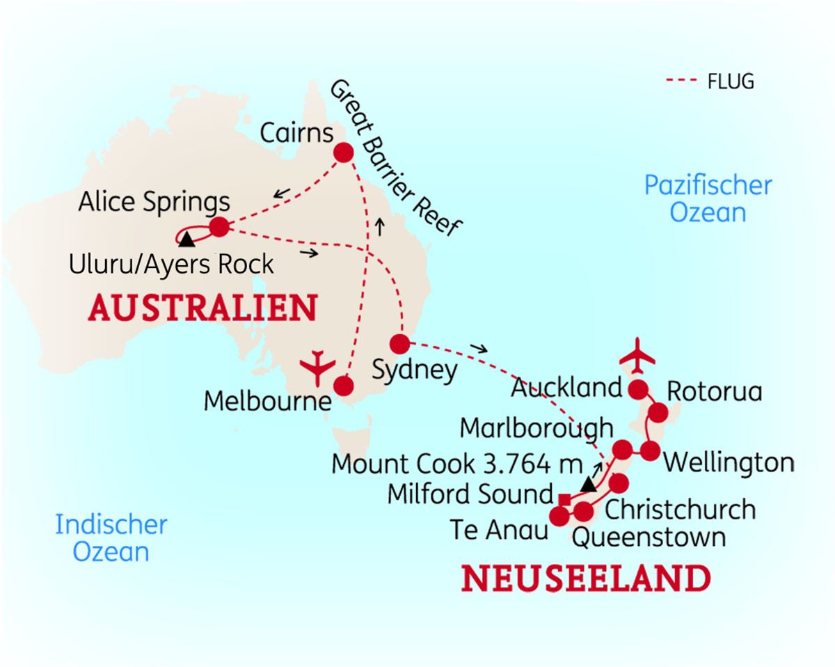 In 25 Tagen erleben Sie das schönste Ende der Welt. Die zwei Länder bieten eine bunte Mischung aus unberührter Natur und aufregenden Metropolen. Von der sonnigen Ostküste Australiens geht es für Sie über das Rote Zentrum in das tropische Queensland und im Anschluss zu den traumhaften Landschaften der Südinsel sowie den kulturellen Höhepunkten der Nordinsel Neuseelands. Tauchen Sie unterwegs immer wieder in die Kultur der Aborigines und Maori ein.