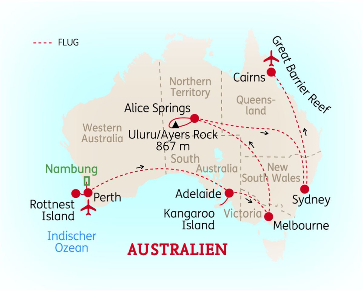 Sie erreichen nach einem kurzen Flug Melbourne, das mehrfach zur lebenswertesten Stadt der Welt gekürt wurde. Dort unternehmen Sie eine Stadtrundfahrt und spazieren durch die kleinen, historischen Stadtparks. 3 Nächte in Melbourne. (F)