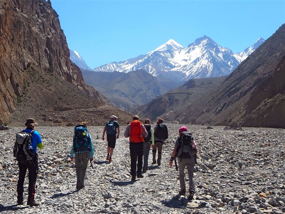 Heute beginnt ihre große Trekkingtour. Nachdem die Lasten auf die Träger verteilt sind, wandern Sie durch das kaum besuchte Lupra-Tal nach Muktinath. Unterwegs ergeben sich grandiose Blicke auf den Bergkoloss Dhaulagiri (8167 m) sowie auf das wüstenähnliche Hochplateau von Mustang. In Muktinath besichtigen Sie die Tempelanlage der wohl wichtigsten Pilgerstätte des nepalesischen Himalaya für Hindus und Buddhisten.
