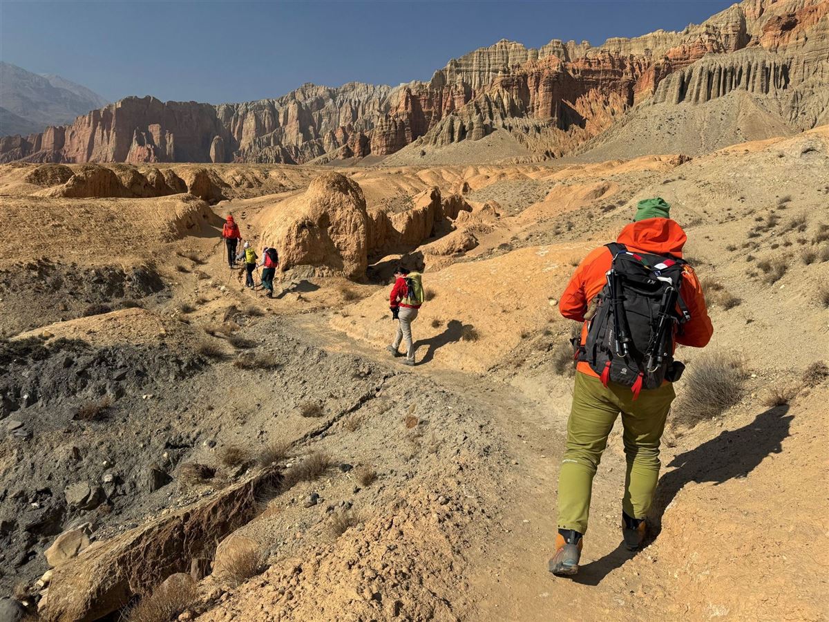 Ein Abstieg führt Sie zum Fluss Dhechyang Khola, an dessen Seite Sie nach Süden wandern. Auf der Strecke passieren Sie kleine Höhlen und uralte Fossilien, die Zeugnisse der geologischen Geschichte des Mustang-Gebiets sind. Der Pfad bleibt größtenteils auf einer relativ niedrigen Höhe, führt durch sandige Abschnitte und Geröllfelder und bietet weite Blicke auf die trockene, fast surreal wirkende Landschaft. Kurz vor Charang steigt der Weg sanft an, bevor man das historische Dorf mit seinen beeindruckenden Chörten und der alten Klosteranlage erreicht. Hier verabschieden Sie sich von ihren Trekkingbegleitern.