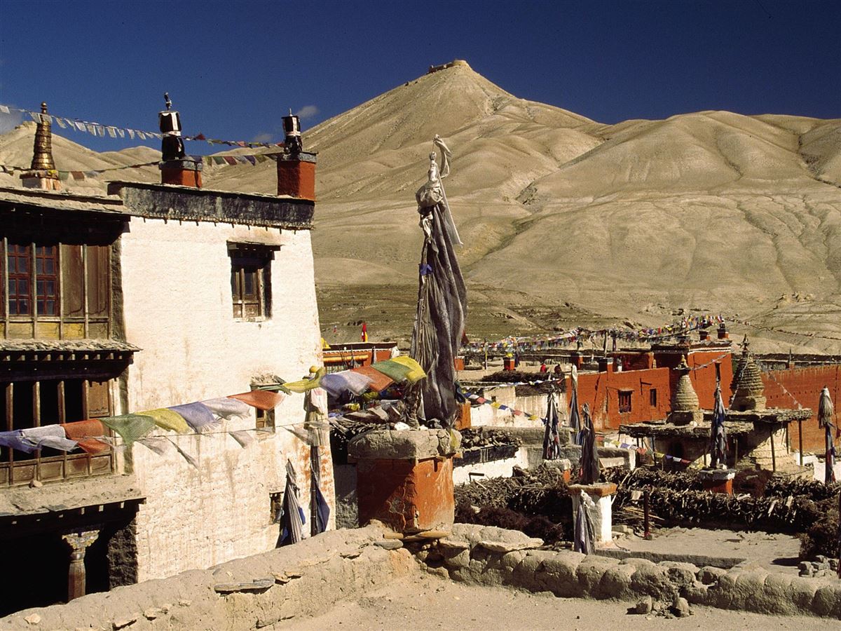 Nach einem zeitigen Aufbruch geht es zu Fuß auf diese längere Tagesetappe. Sie wandern über den Mui-La-Pass (4170 m) nach Ghar Gumpa, ehe Sie über einen weiteren Pass, den Morang-La (4280 m), talabwärts in die Mustang-Hauptstadt Lo Manthang gelangen. Die von riesigen Weidegebieten umgebene Stadt ist durch eine wehrhafte Stadtmauer geschützt und wurde 1380 durch den ersten König von Mustang erbaut. Am meisten beeindrucken in Lo Manthang die engen Gassen und Häuserreihen.