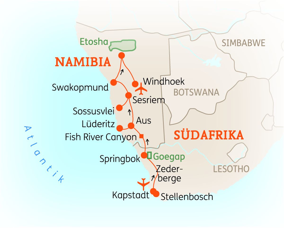 Sie überqueren die Grenze nach Namibia. Ihre neue Reiseleitung heißt Sie herzlich Willkommen! Sie fahren ab jetzt in einem bequemen Offroad Truck. Weiter geht es nun zum Fish River Canyon. Mit 160 Kilometern Länge und bis zu 550 Metern Tiefe ist er durchaus imposant. Genießen Sie Freizeit am Nachmittag. 1 Nacht am Canyon. (F/A)