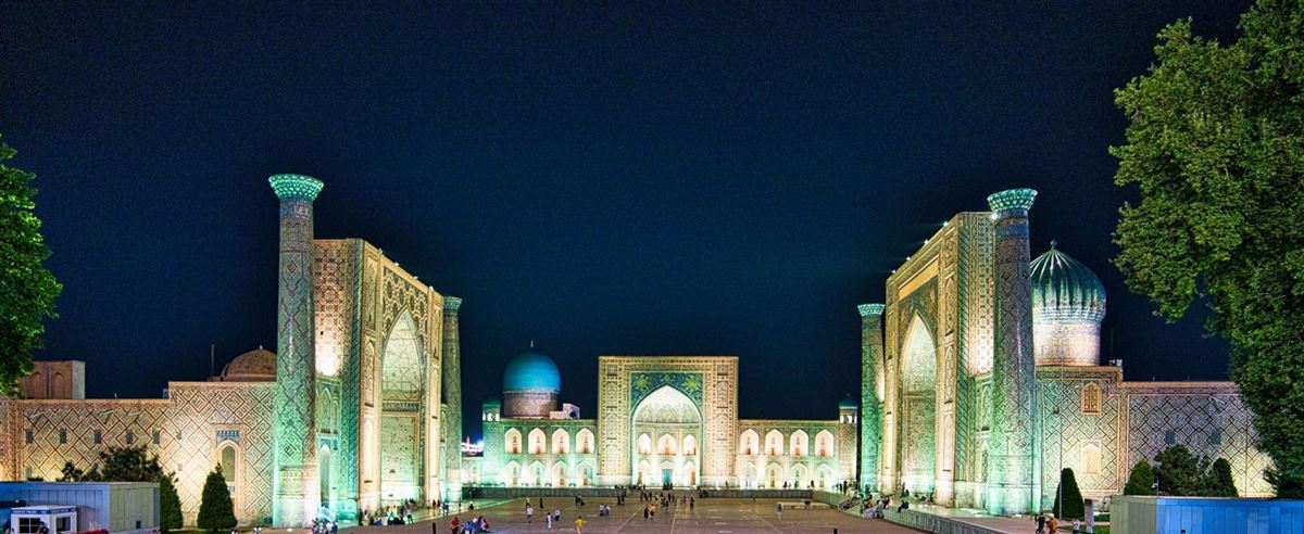 Der ganze Tag steht für die vielen Sehenswürdigkeiten der über 2700 Jahre alten Stadt (UNESCO-Weltkulturerbe) zur Verfügung. Samarkand gilt als Perle des Orients. Dass dies nicht übertrieben ist, erkennen Sie, wenn Sie auf dem Registan stehen. Dieser sagenhafte Platz ist eingerahmt von einem einzigartigen Ensemble der Medresen Ulugbek, Tilla-Kori und Scher-Dor. Jede für sich ist ein Meisterwerk orientalischer Baukunst – reich verziert mit filigran gearbeiteten Mosaiken, die in scheinbar unendlich vielen Blautönen erstrahlen. Sie atmen den Hauch des Orients und der Märchen aus „1001 Nacht“. Am späteren Nachmittag, wenn das Licht wieder warm und die Schatten länger werden, ist das Mausoleum Gur-Emir ein lohnendes Ziel. Architektur und Perspektive sind fotografische Themen, die hier eine Vielzahl von Möglichkeiten bieten. Begeben Sie sich nach dem Abendessen wieder zum „Herz der antiken Stadt“ – dem Registan-Platz, um diesen beim stimmungsvollen Sonnenuntergang zu erleben. Genießen Sie heute die märchenhafte Lichtershow, welche den Platz in die schönsten Farben hüllt.