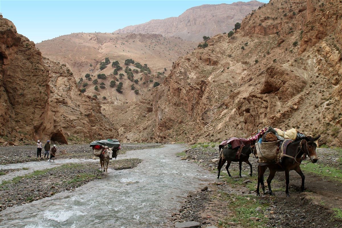 Heute brauchen Sie keine Bergschuhe, sondern vielmehr Wasserschuhe (wie Trekkingsandalen). Die Etappe führt Sie durch die spektakulären Schluchten des M'Goun-Massivs und es erwarten Sie zahlreiche Flussdurchquerungen, bei denen Ihnen das Wasser mitunter bis zu den Knien reicht. Ihr Tagesziel befindet sich in der Nähe des Dorfes Aguerzega (1.900 m).