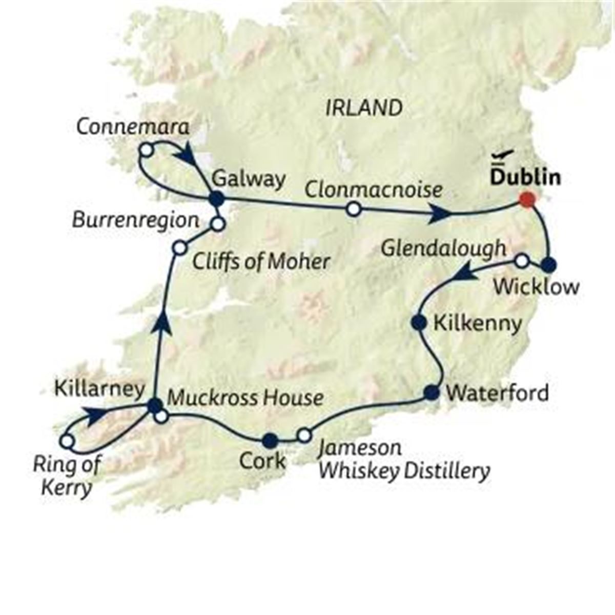 Die frühchristliche Klostersiedlung Glendalough gilt aufgrund ihrer Lage in einem dicht bewaldeten Tal mit zwei Seen als einer der malerischsten Orte Irlands. Ein weiterer Stopp lohnt in der mittelalterlichen Stadt Kilkenny. Ihr Tagesziel Waterford wurde im Jahr 835 von den Wikingern gegründet und hat sich durch die Lage am River Suir zu einem bedeutenden Seehafen entwickelt.