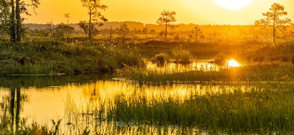 Der Name Soomaa bedeutet Moorland und das sagt ganz genau, worum es in diesem europaweit größten Regenmoor-Nationalpark geht. Die Landschaft mit riesigen Hochmooren, nassen Wäldern und ursprünglichen und stark mäandernden Flüssen war in der Vergangenheit zu kompliziert für eine Kultivierung. Nach Ende des Kalten Krieges wurde der Soomaa-Nationalpark gegründet, um diese wertvolle Natur zu schützen. Wir wollen das alles hautnah und abenteuerlich erleben. Dafür startest du am Vormittag zu einer Kanutour auf einem Naturfluss, an dessen Ufer riesige Eichen, uralte Zitterpappeln und Birken wachsen. Zwischen den Bäumen kannst du immer wieder Biberburgen und Gänge erspähen. Am Nachmittag wartet im Soomaa-Nationalpark ein besonderes Abenteuer auf dich. Du wanderst in diesem Hochmoor-Nationalpark mit Moorschuhen und bestaunst dabei zahlreiche Moorpflanzen, Beeren und Pilze. Das Hochmoor besteht zu etwa 95 Prozent aus Wasser und das kannst du gleich erfühlen, wenn du mit Moorschuhen auf weichem und feuchtem Boden gehst. Unterwegs siehst du vielleicht auch Birkhühner oder Bruchwasserläufer. Außer dem Bodenwasser gibt es im Moor übrigens auch sogenannte Mooraugen, kleine Seen, wo das Wasser bräunlich und extrem süß sowie sehr sauber ist. Hier solltest du unbedingt baden gehen. Das erst etwas unheimlich wirkende dunkle Wasser ist weich und in ihm zu schwimmen ist ein unvergessliches Erlebnis. Zum Abschluss kannst du dich auf einen Saunaabend freuen. Die Saunakultur gilt in Finnland als fester Bestandteil des Lebens und wurde daher zum immateriellen Kulturerbe der UNESCO erklärt. Nach einem langen Tag in der Natur gibt es nichts Besseres als ein gesundes Peeling mit Birkenzweigen.