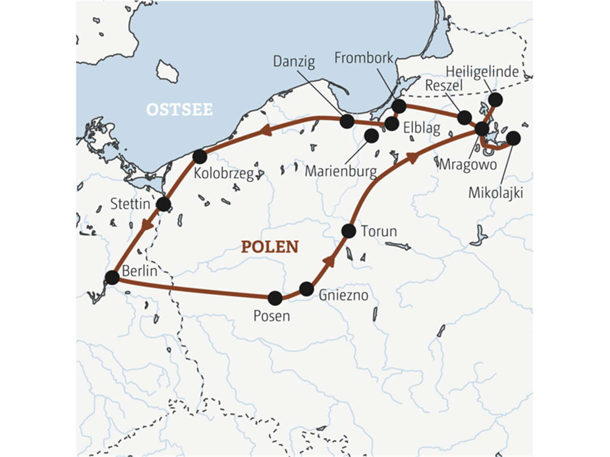 Nach dem Frühstück Fahrt nach Gniezno (Gnesen), wo uns die Krönungskirche der polnischen Könige in ihren Bann zieht. Auf den historischen Bronzetüren verfolgen wir auf 18 Reliefs den heiligen Adalbert beim Missionieren der Pruzzen. Auf den Spuren der Kreuzritter fahren wir weiter nach Torun (Thorn). Beim Stadtrundgang fallen uns die vielen jungen Leute auf: Torun ist eine bedeutende Studentenstadt. Die Geburtsstadt von Nikolaus Kopernikus bietet Backsteingotik vom Feinsten: Wir bestaunen Kirchen, Bürgerhäuser, Speicher und Wehrmauern. Am Nachmittag Weiterfahrt nach Mragowo (Sensburg), wo wir die nächsten drei Nächte verbringen.